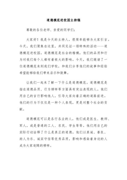 【七哥公文】2024年:道德模范进校园主持稿+更多免费公文+VX:QiGeGongWen2024