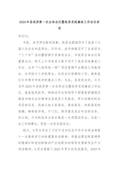 【七哥公文】2024年:2024年县政府第一次全体会议暨政府系统廉政工作会议讲话+更多免费公文+VX:QiGeGongWen2024
