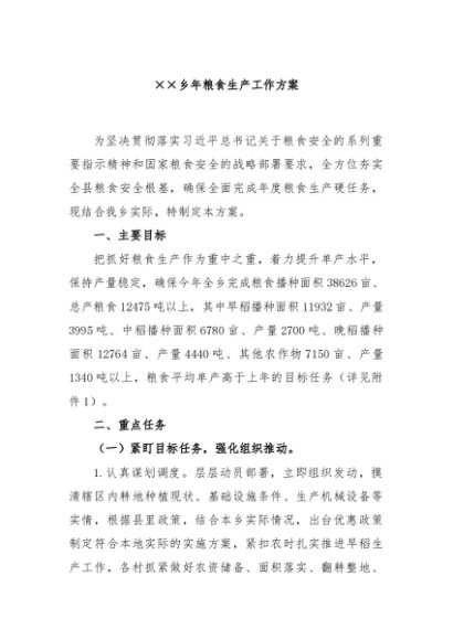 / 【七哥公文】2024年:××乡年粮食生产工作方案+更多免费公文+VX:QiGeGongWen2024