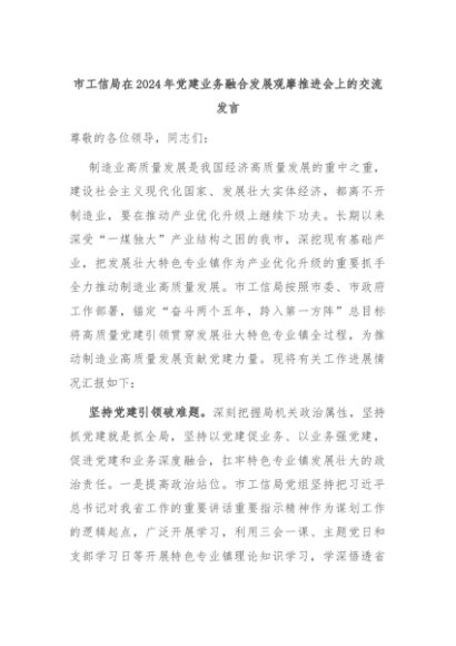 【七哥公文】2024年:市工信局在2024年党建业务融合发展观摩推进会上的交流发言+更多免费公文+VX:QiGeGongWen2024