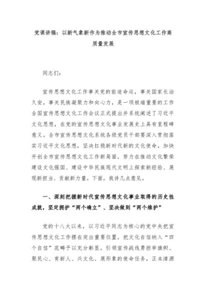 【七哥公文】2024年:党课讲稿:以新气象新作为推动全市宣传思想文化工作高质量发展+更多免费公文+VX:QiGeGongWen2024