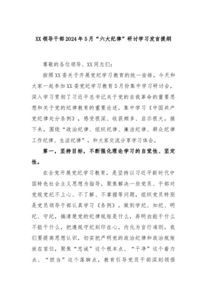 【七哥公文】2024年:XX领导干部2024年5月“六大纪律”研讨学习发言提纲+更多免费公文+VX:QiGeGongWen2024