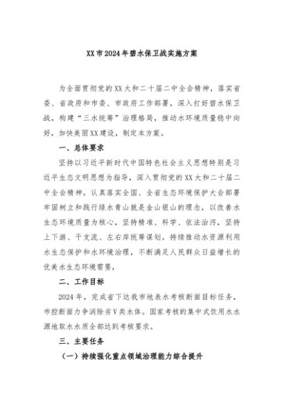 / 【七哥公文】2024年:XX市2024年碧水保卫战实施方案+更多免费公文+VX:QiGeGongWen2024