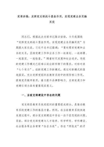 【七哥公文】2024年:党课讲稿:发挥党支部战斗堡垒作用,实现党建业务双融双促+更多免费公文+VX:QiGeGongWen2024