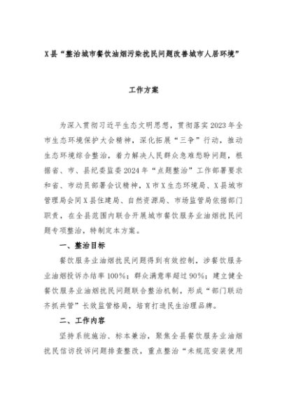 【七哥公文】2024年:X县“整治城市餐饮油烟污染扰民问题改善城市人居环境”工作方案+更多免费公文+VX:QiGeGongWen2024