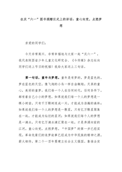 【七哥公文】2024年:在庆“六一”图书捐赠仪式上的讲话:童心向党,点燃梦想+更多免费公文+VX:QiGeGongWen2024