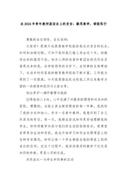 【七哥公文】2024年:在2024年青年教师座谈会上的发言:勤思善学,砺能笃行+更多免费公文+VX:QiGeGongWen2024
