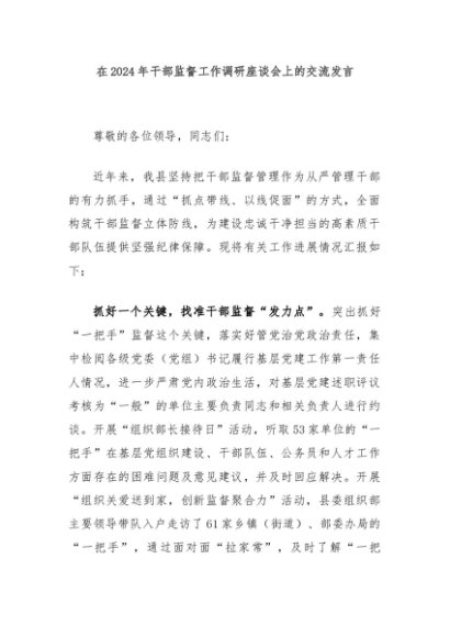 / 【七哥公文】2024年:在2024年干部监督工作调研座谈会上的交流发言+更多免费公文+VX:QiGeGongWen2024