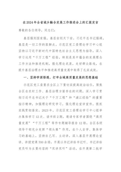 【七哥公文】2024年:在2024年全省城乡融合发展工作推进会上的汇报发言+更多免费公文+VX:QiGeGongWen2024