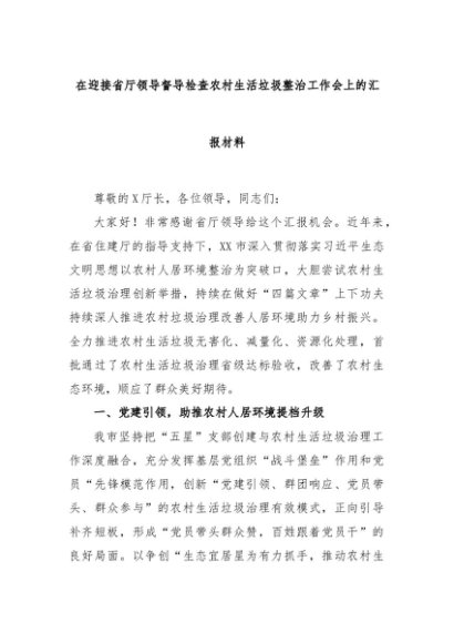【七哥公文】2024年:在迎接省厅领导督导检查农村生活垃圾整治工作会上的汇报材料+更多免费公文+VX:QiGeGongWen2024