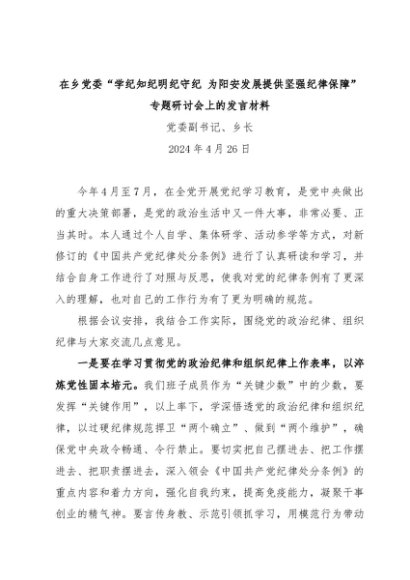 【七哥公文】2024年:在乡党委“学纪知纪明纪守纪 为阳安发展提供坚强纪律保障”专题研讨会上的发言材料+更多免费公文+VX:QiGeGongWen2024