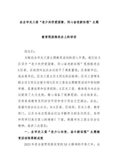 【七哥公文】2024年:在全市关工委“老少共抒爱国情、同心奋进新征程”主题教育现场推进会上的讲话+更多免费公文+VX:QiGeGongWen2024