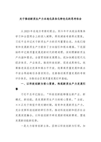 / 【七哥公文】2024年:关于推动新质生产力本地化具体化特色化的思考体会+更多免费公文+VX:QiGeGongWen2024
