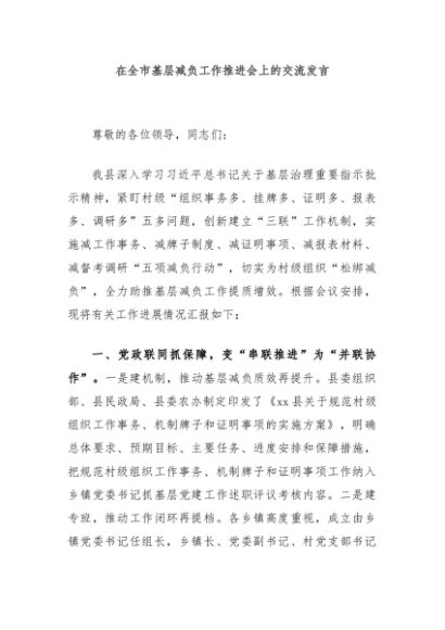 / 【七哥公文】2024年:在全市基层减负工作推进会上的交流发言+更多免费公文+VX:QiGeGongWen2024
