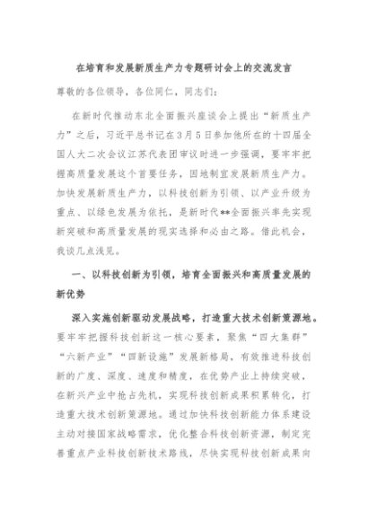 / 【七哥公文】2024年:在培育和发展新质生产力专题研讨会上的交流发言+更多免费公文+VX:QiGeGongWen2024