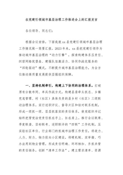 / 【七哥公文】2024年:在党建引领城市基层治理工作推进会上的汇报发言+更多免费公文+VX:QiGeGongWen2024