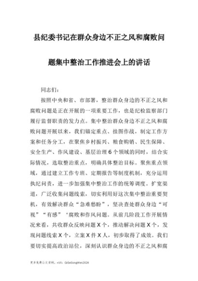 【七哥公文】2024年:县纪委书记在群众身边不正之风和腐败问题集中整治工作推进会上的讲话+更多免费公文+VX:QiGeGongWen2024