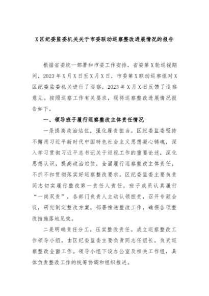【七哥公文】2024年:X区纪委监委机关关于市委联动巡察整改进展情况的报告+更多免费公文+VX:QiGeGongWen2024