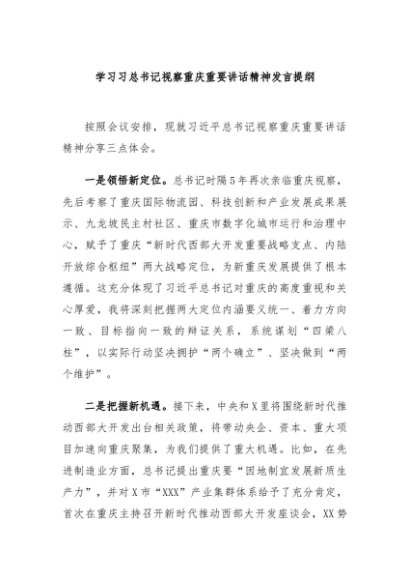 / 【七哥公文】2024年:学习习总书记视察重庆重要讲话精神发言提纲+更多免费公文+VX:QiGeGongWen2024