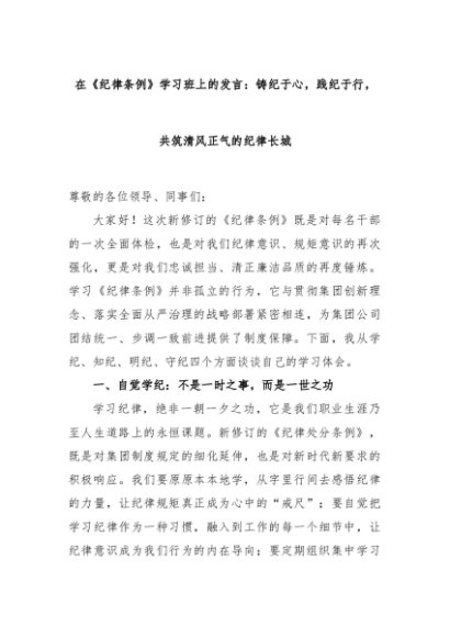 【七哥公文】2024年:在《纪律条例》学习班上的发言:铸纪于心,践纪于行,共筑清风正气的纪律长城+更多免费公文+VX:QiGeGongWen2024
