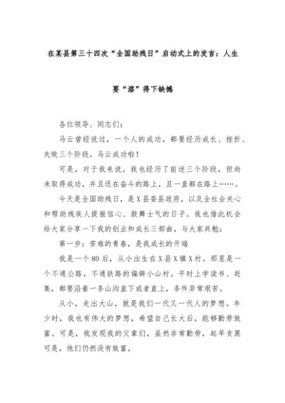 【七哥公文】2024年:在某县第三十四次“全国助残日”启动式上的发言:人生要“溶”得下缺憾+更多免费公文+VX:QiGeGongWen2024