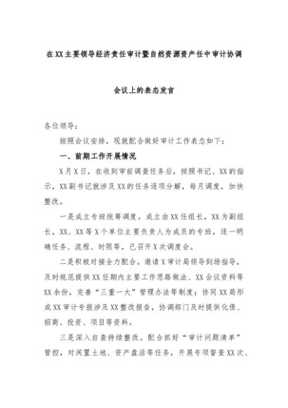 【七哥公文】2024年:在XX主要领导经济责任审计暨自然资源资产任中审计协调会议上的表态发言+更多免费公文+VX:QiGeGongWen2024