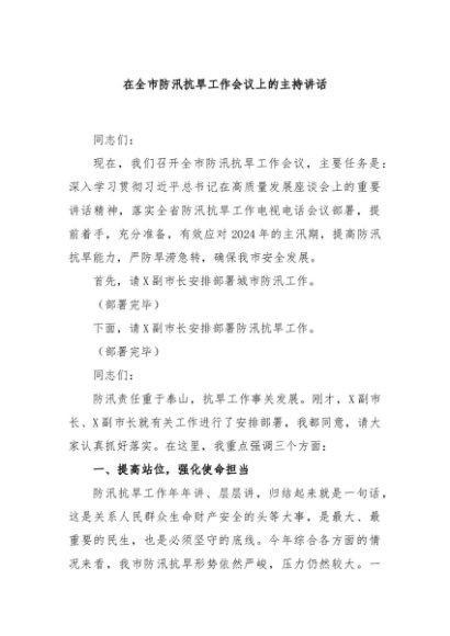 / 【七哥公文】2024年:在全市防汛抗旱工作会议上的主持讲话+更多免费公文+VX:QiGeGongWen2024
