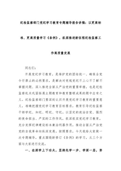 【七哥公文】2024年:纪检监察部门党纪学习教育专题辅导报告讲稿:以更高标准、更高质量学习《条例》,纵深推进新征程纪检监察工作高质量发展+更多免费公文+VX:QiGeGongWen2024
