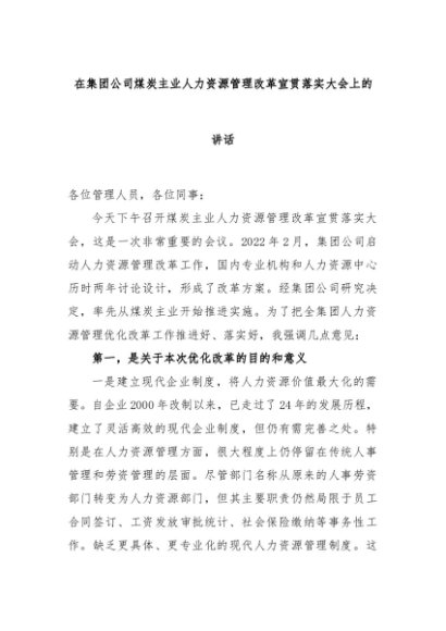 【七哥公文】2024年:在集团公司煤炭主业人力资源管理改革宣贯落实大会上的讲话+更多免费公文+VX:QiGeGongWen2024