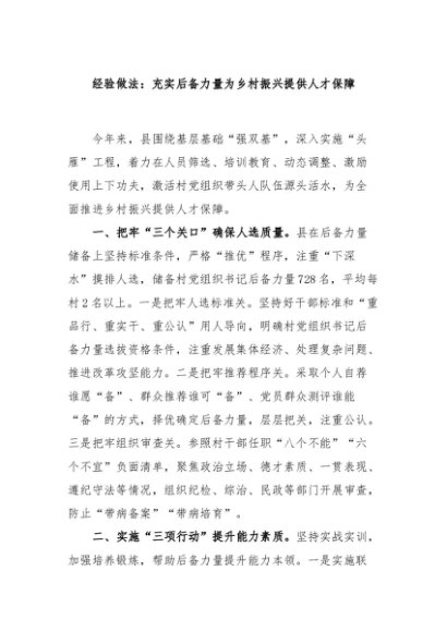 / 【七哥公文】2024年:经验做法:充实后备力量为乡村振兴提供人才保障+更多免费公文+VX:QiGeGongWen2024