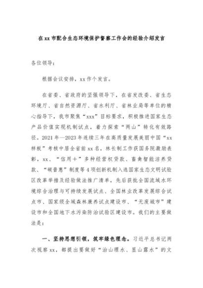 / 【七哥公文】2024年:在xx市配合生态环境保护督察工作会的经验介绍发言+更多免费公文+VX:QiGeGongWen2024