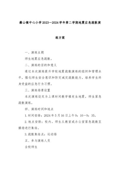 【七哥公文】2024年:籍山镇中心小学2023-2024学年第二学期地震应急疏散演练方案+更多免费公文+VX:QiGeGongWen2024
