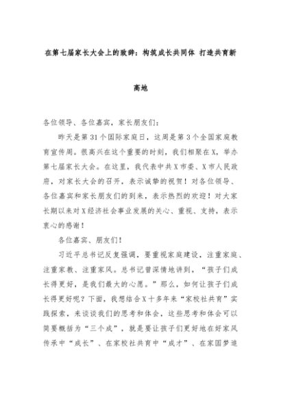 【七哥公文】2024年:在第七届家长大会上的致辞:构筑成长共同体 打造共育新高地+更多免费公文+VX:QiGeGongWen2024