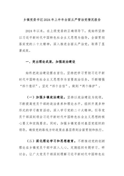 【七哥公文】2024年:乡镇党委书记2024年上半年全面从严管治党情况报告+更多免费公文+VX:QiGeGongWen2024