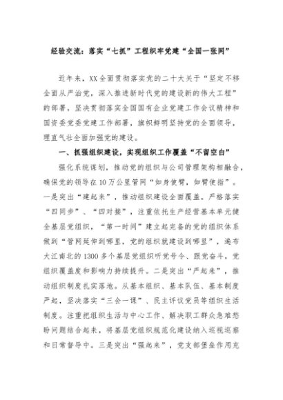 / 【七哥公文】2024年:经验交流:落实“七抓”工程织牢党建“全国一张网”+更多免费公文+VX:QiGeGongWen2024