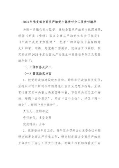 【七哥公文】2024年:2024年党支部全面从严治党主体责任分工及责任清单+更多免费公文+VX:QiGeGongWen2024