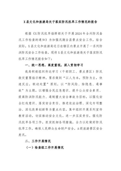 / 【七哥公文】2024年:X县文化和旅游局关于落实防汛抗旱工作情况的报告+更多免费公文+VX:QiGeGongWen2024