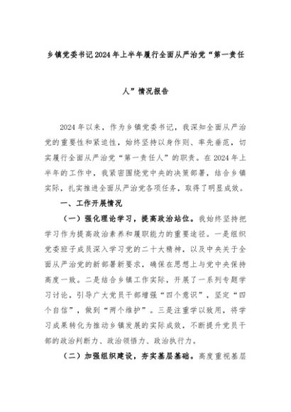 / 【七哥公文】2024年:乡镇党委书记2024年上半年履行全面从严治党+更多免费公文+VX:QiGeGongWen2024