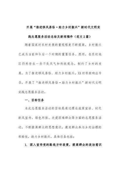 【七哥公文】2024年:(2篇)开展“推进移风易俗·助力乡村振兴”新时代文明实践志愿服务活动总结及新闻稿件+更多免费公文+VX:QiGeGongWen2024