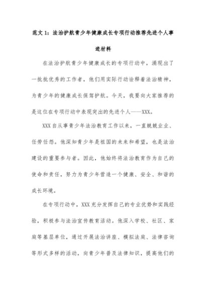 【七哥公文】2024年:(4篇)法治护航青少年健康成长专项行动推荐先进个人事迹材料+更多免费公文+VX:QiGeGongWen2024