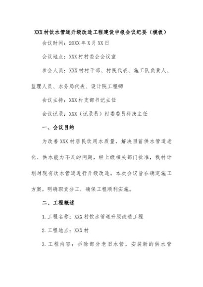 【七哥公文】2024年:XXX村饮水管道升级改造工程建设申报会议记录+更多免费公文+VX:QiGeGongWen2024