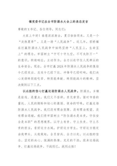 / 【七哥公文】2024年:镇党委书记在全市防溺水大会上的表态发言 (1)+更多免费公文+VX:QiGeGongWen2024