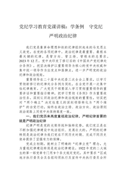 【七哥公文】2024年:党纪学习教育党课讲稿:学条例+守党纪+严明政治纪律+更多免费公文+VX:QiGeGongWen2024