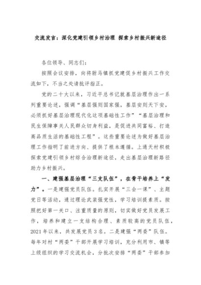 【七哥公文】2024年:交流发言:深化党建引领乡村治理 探索乡村振兴新途径 (1)+更多免费公文+VX:QiGeGongWen2024
