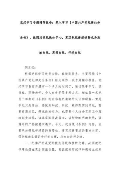 【七哥公文】2024年:党纪学习专题辅导报告:深入学习《中国共产党纪律处分条例》,做到对党纪熟知于心,真正把纪律规矩转化为政治自觉、思想自觉、行动自觉+更多免费公文+VX:QiGeGongWen2024