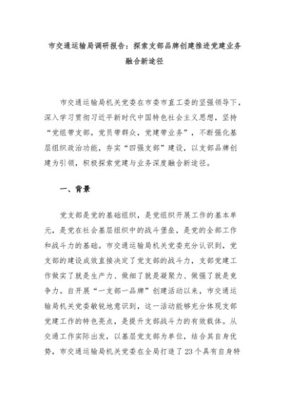 【七哥公文】2024年:市交通运输局调研报告:探索支部品牌创建推进党建业务融合新途径+更多免费公文+VX:QiGeGongWen2024