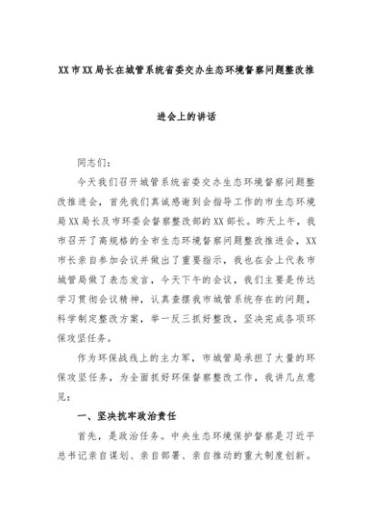 【七哥公文】2024年:XX市XX局长在城管系统省委交办生态环境督察问题整改推进会上的讲话 (1)+更多免费公文+VX:QiGeGongWen2024