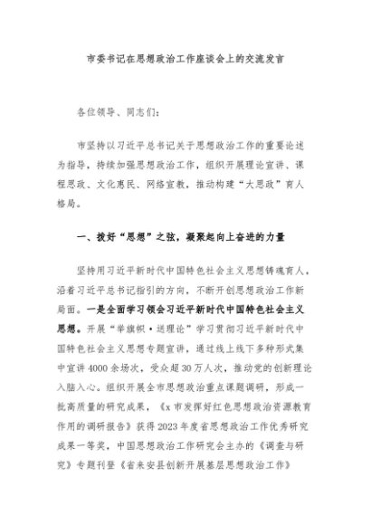 / 【七哥公文】2024年:市委书记在思想政治工作座谈会上的交流发言+更多免费公文+VX:QiGeGongWen2024
