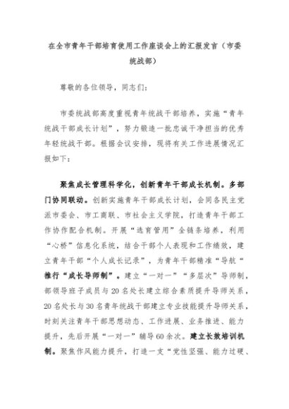 【七哥公文】2024年:在全市青年干部培育使用工作座谈会上的汇报发言(市委统战部)+更多免费公文+VX:QiGeGongWen2024