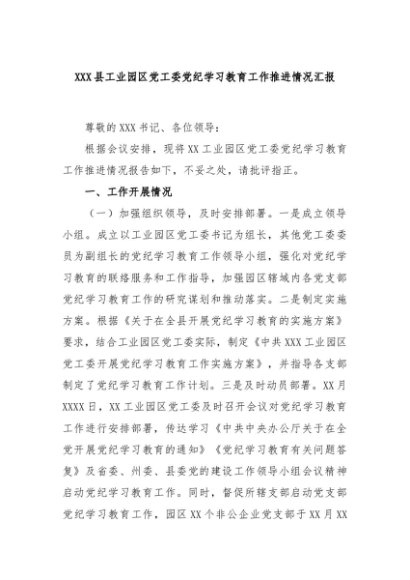 【七哥公文】2024年:XXX县工业园区党工委党纪学习教育工作推进情况汇报+更多免费公文+VX:QiGeGongWen2024